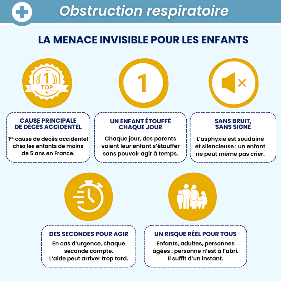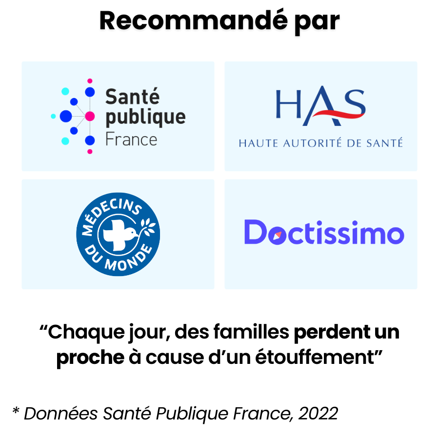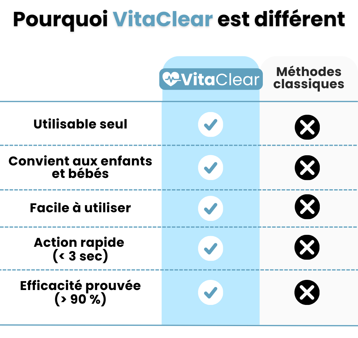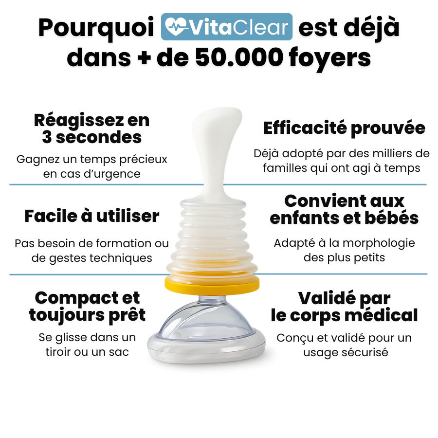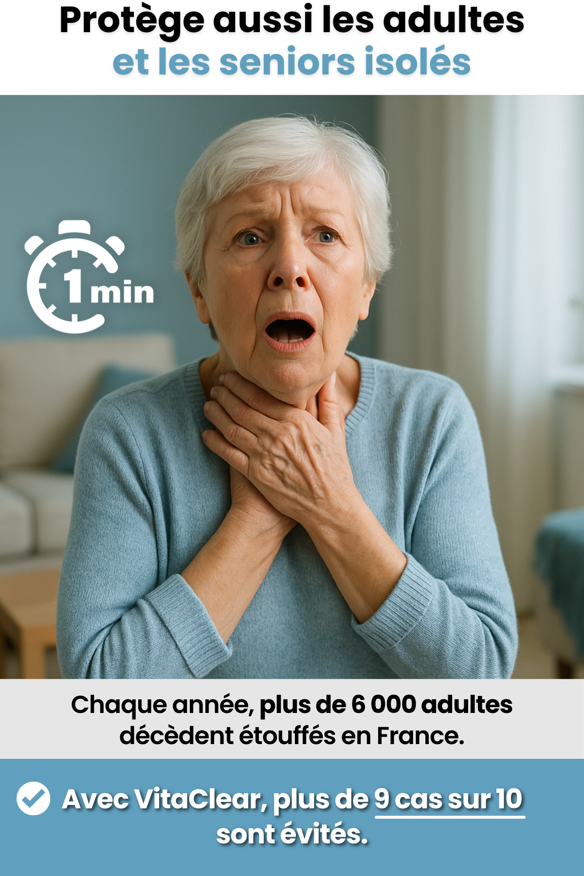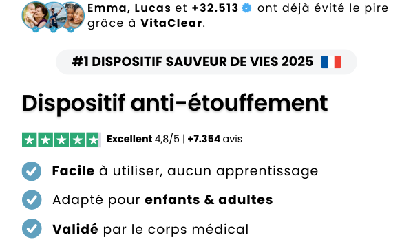 La manœuvre de Heimlich échoue dans environ 30 % des cas. VitaClear agit en moins de 3 secondes avec un taux de réussite de 98 %, même lorsque les gestes classiques ne fonctionnent pas.